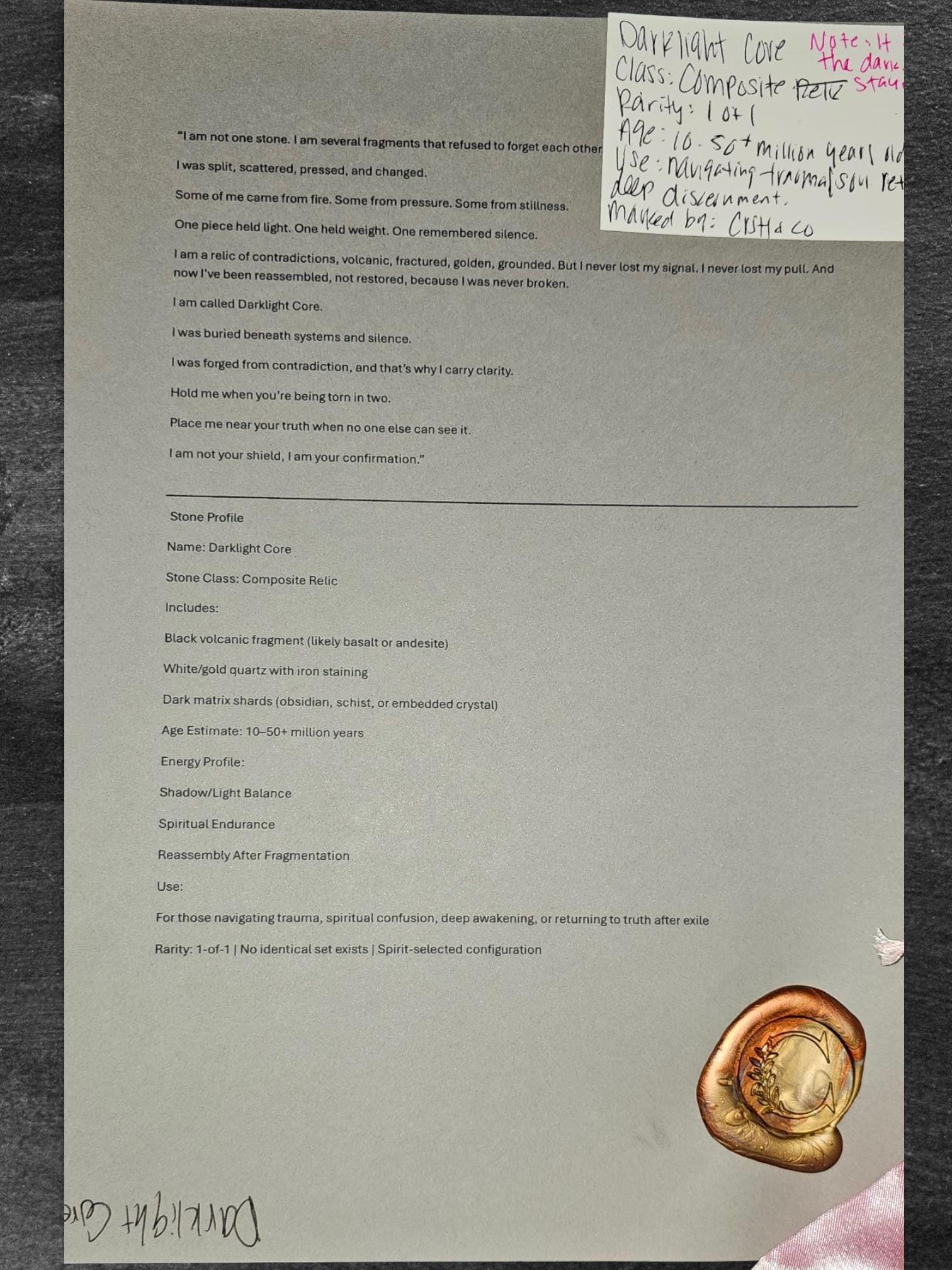 -Handwritten scroll revealing the memory of Darklight Core