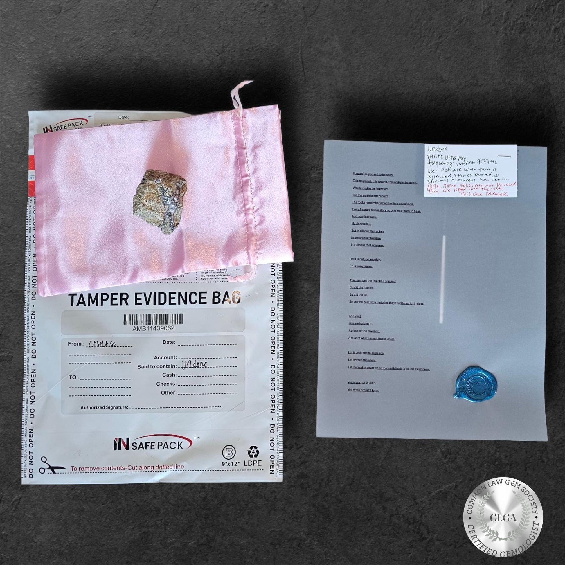 "I was shaped by pressure, marked by breaks, yet I never shattered. My surface carries scars of time, my veins tell stories of endurance. I was hidden in forbidden ground, but I remain UNDONE. My testimony belongs to you now."
